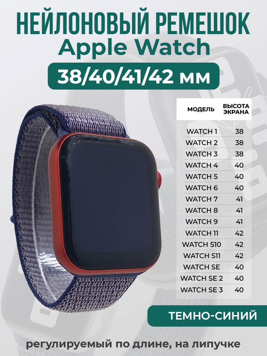 Нейлоновый ремешок на липучке для Apple Watch 1-9 / SE (38/40/41 мм), регулируемый по длине, темно-синий