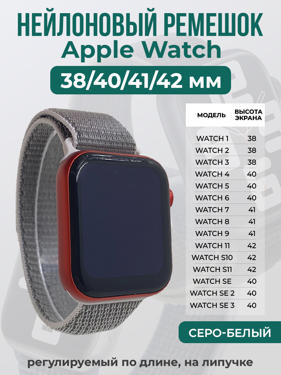 Нейлоновый ремешок на липучке для Apple Watch 1-9 / SE (38/40/41 мм), регулируемый по длине, серо-белый