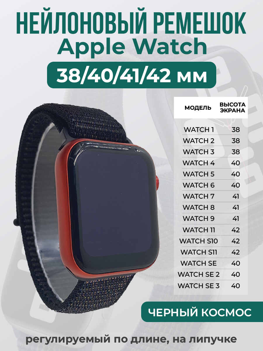 Нейлоновый ремешок на липучке для Apple Watch 1-9 / SE (38/40/41 мм), регулируемый по длине, черный космос