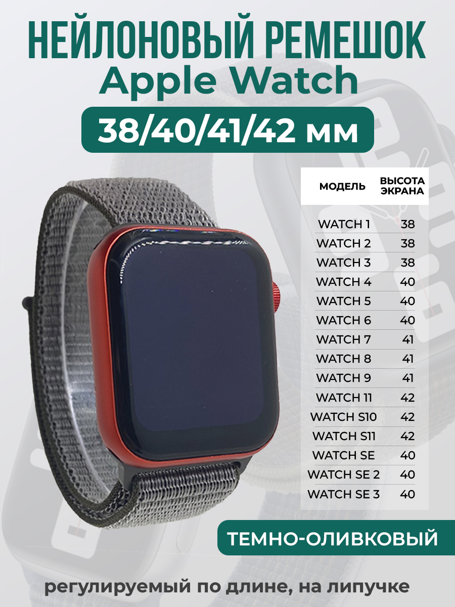 Нейлоновый ремешок на липучке для Apple Watch 1-9 / SE (38/40/41 мм), регулируемый по длине, темно-оливковый