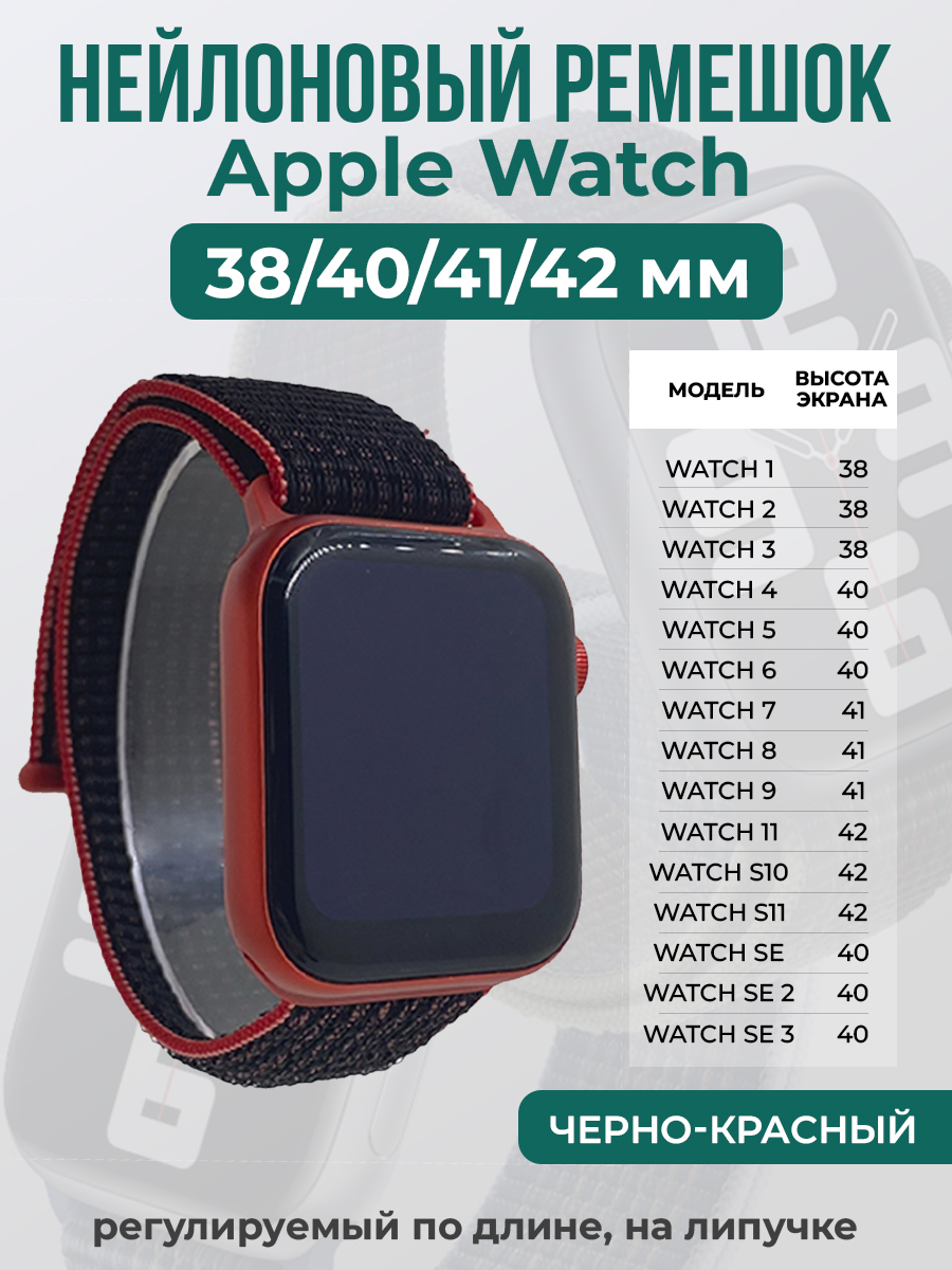 Нейлоновый ремешок на липучке для Apple Watch 1-9 / SE (38/40/41 мм), регулируемый по длине, черно-красный