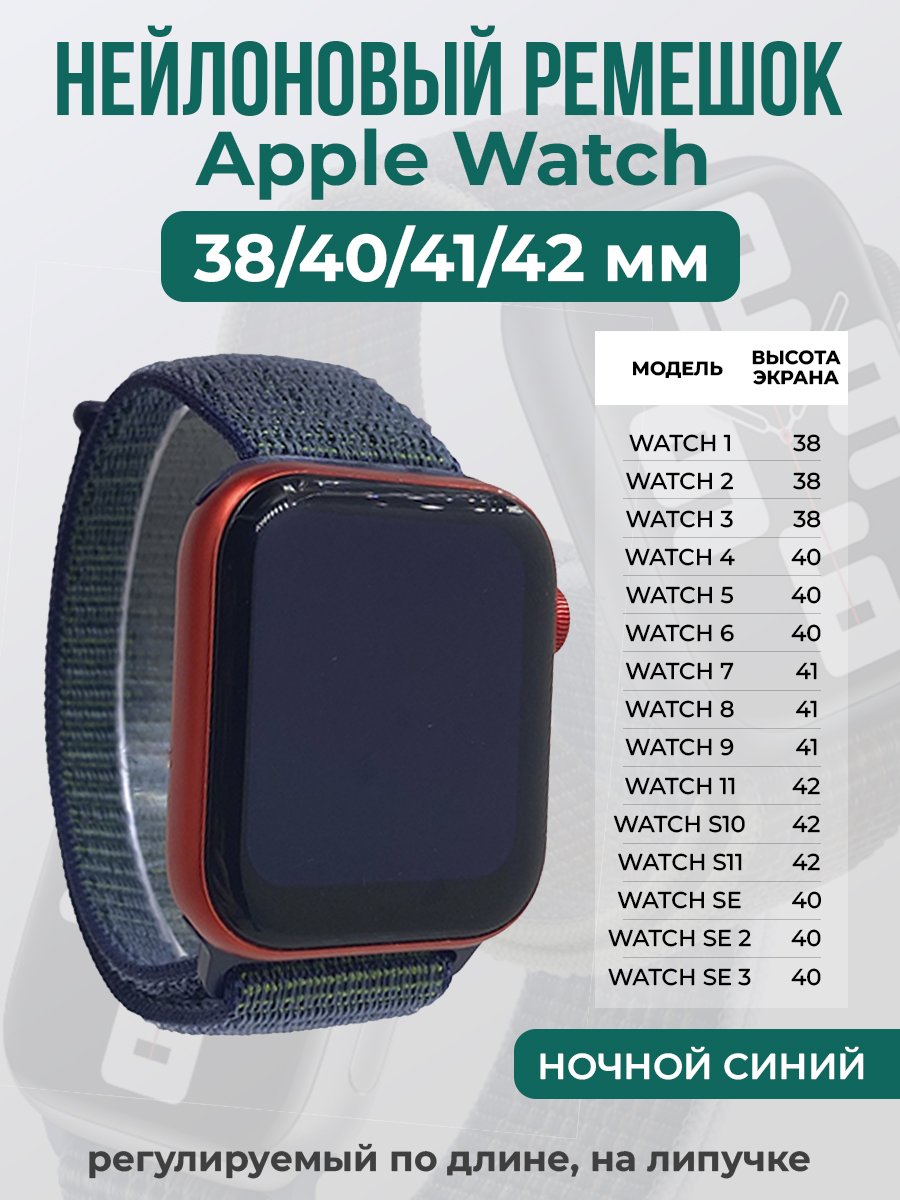 Нейлоновый ремешок на липучке для Apple Watch 1-9 / SE (38/40/41 мм), регулируемый по длине, ночной синий