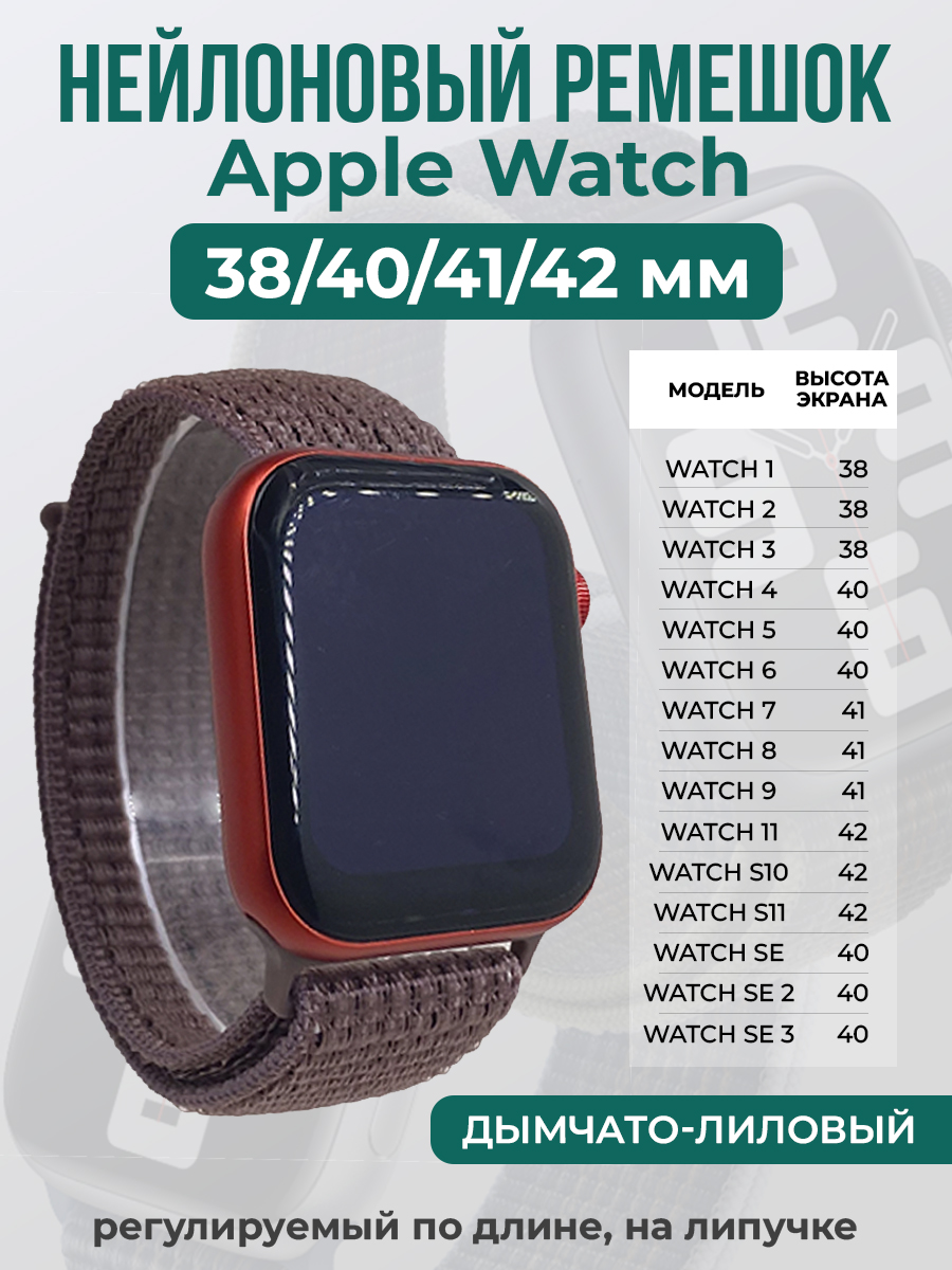 Нейлоновый ремешок на липучке для Apple Watch 1-9 / SE (38/40/41 мм), регулируемый по длине, дымчато-лиловый