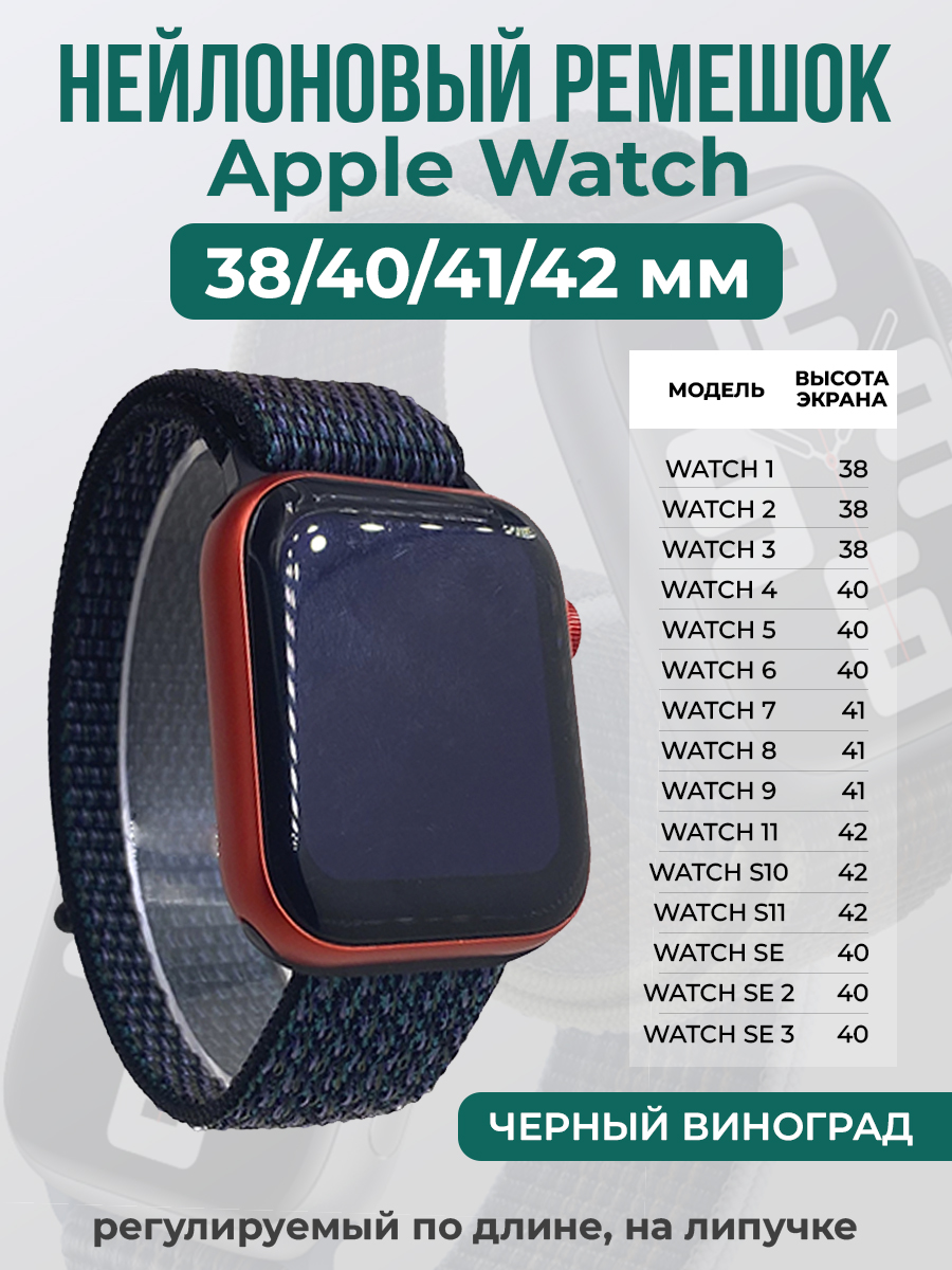 Нейлоновый ремешок на липучке для Apple Watch 1-9 / SE (38/40/41 мм), регулируемый по длине, черный виноград