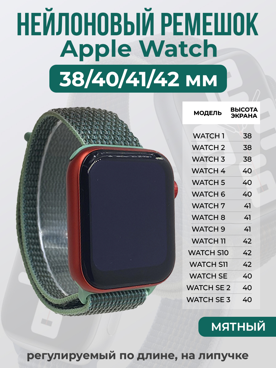 Нейлоновый ремешок на липучке для Apple Watch 1-9 / SE (38/40/41 мм), регулируемый по длине, мятный