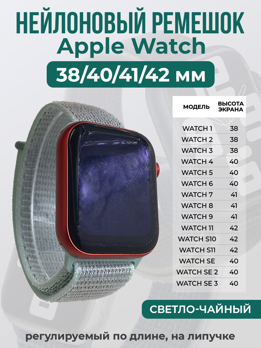 Нейлоновый ремешок на липучке для Apple Watch 1-9 / SE (38/40/41 мм), регулируемый по длине подходит для смарт-часов Apple Watch series 1/2/3/4/5/6/7/8/9/SE с размерами циферблата: 38 мм, 40 мм и 41 мм. Ремешок для часов iPhone выполнен из гипоаллергенного нейлона.