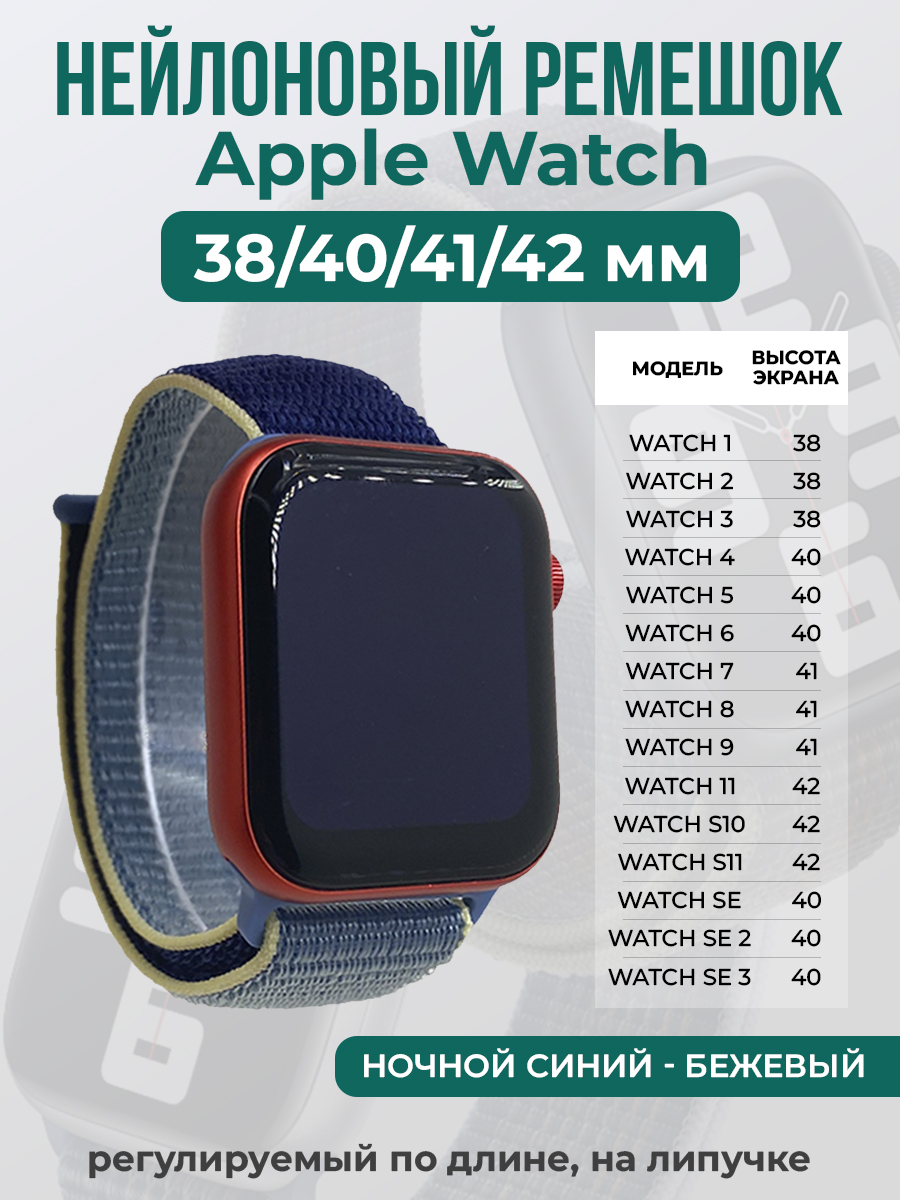 Нейлоновый ремешок на липучке для Apple Watch 1-9 / SE (38/40/41 мм), регулируемый по длине, ночной синий - бежевый