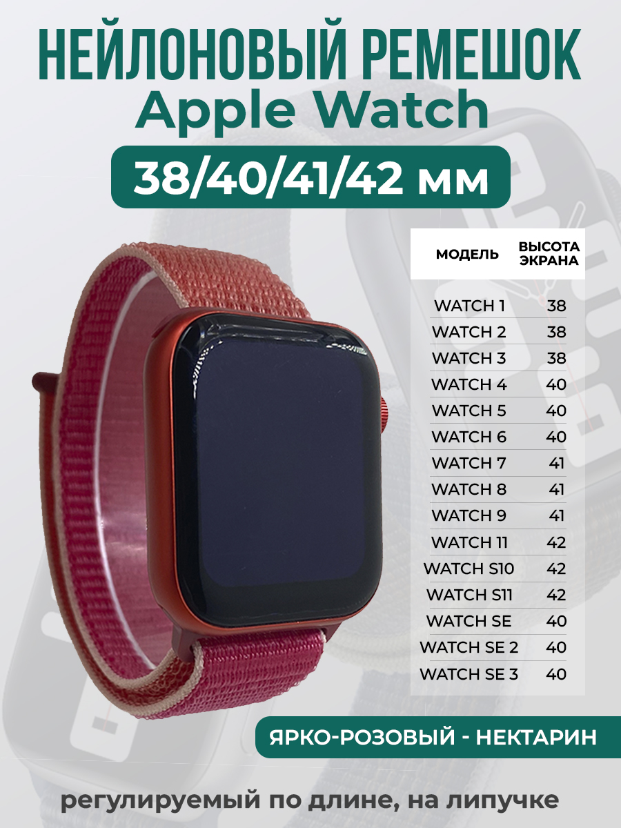 Нейлоновый ремешок на липучке для Apple Watch 1-9 / SE (38/40/41 мм), регулируемый по длине, ярко-розовый - нектарин