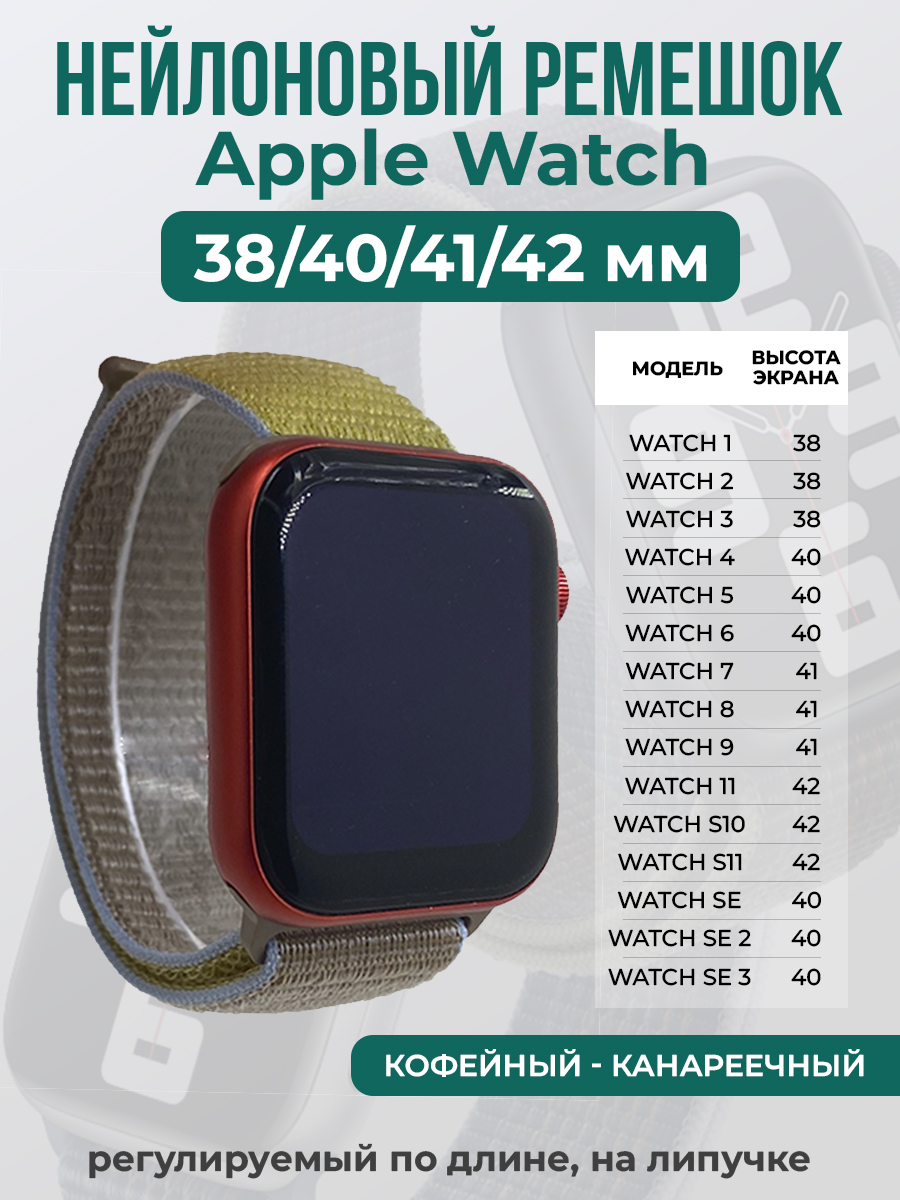Нейлоновый ремешок на липучке для Apple Watch 1-9 / SE (38/40/41 мм), регулируемый по длине, кофейный - канареечный