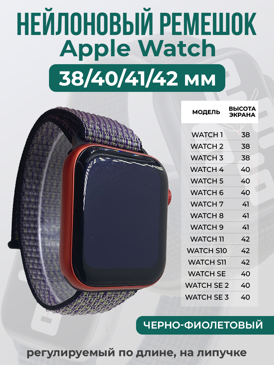 Нейлоновый ремешок на липучке для Apple Watch 1-9 / SE (38/40/41 мм), регулируемый по длине подходит для смарт-часов Apple Watch series 1/2/3/4/5/6/7/8/9/SE с размерами циферблата: 38 мм, 40 мм и 41 мм. Ремешок для часов iPhone выполнен из гипоаллергенного нейлона.