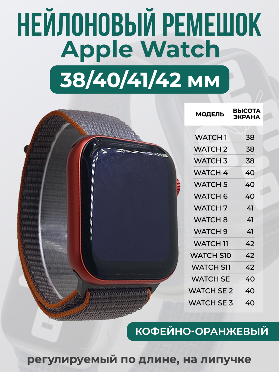 Нейлоновый ремешок на липучке для Apple Watch 1-9 / SE (38/40/41 мм), регулируемый по длине, кофейно-оранжевый