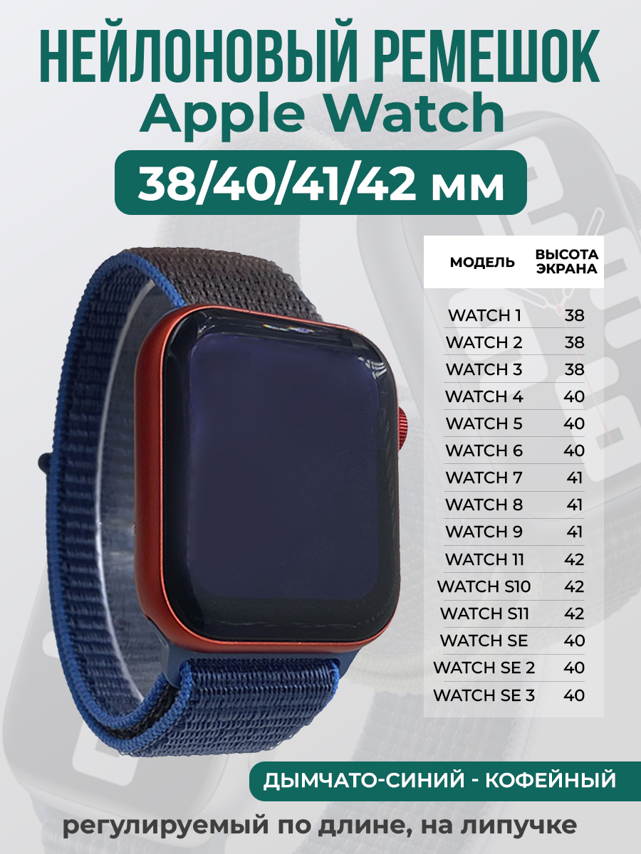 Нейлоновый ремешок на липучке для Apple Watch 1-9 / SE (38/40/41 мм), регулируемый по длине, дымчато-синий - кофейный
