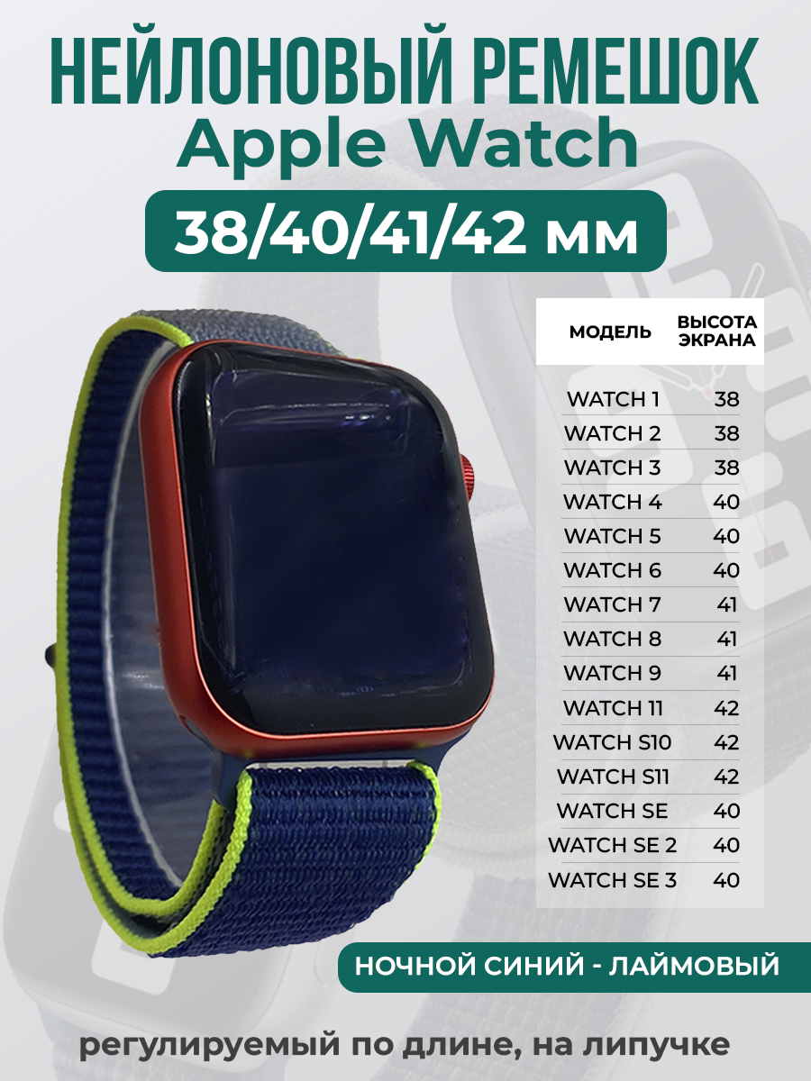 Нейлоновый ремешок на липучке для Apple Watch 1-9 / SE (38/40/41 мм), регулируемый по длине, ночной синий - лаймовый