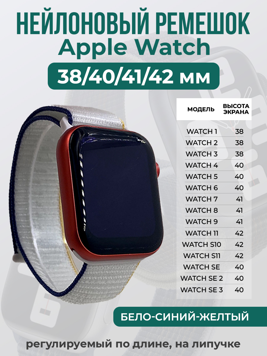 Нейлоновый ремешок на липучке для Apple Watch 1-9 / SE (38/40/41 мм), регулируемый по длине, бело-синий-желтый