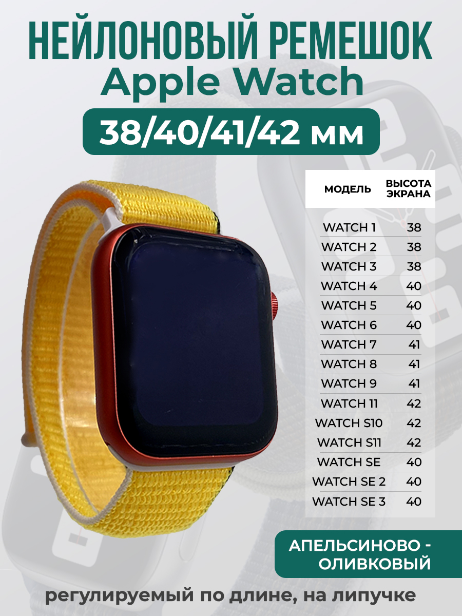 Нейлоновый ремешок на липучке для Apple Watch 1-9 / SE (38/40/41 мм), регулируемый по длине, апельсиново - оливковый