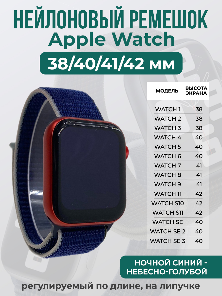 Нейлоновый ремешок на липучке для Apple Watch 1-9 / SE (38/40/41 мм), регулируемый по длине подходит для смарт-часов Apple Watch series 1/2/3/4/5/6/7/8/9/SE с размерами циферблата: 38 мм, 40 мм и 41 мм. Ремешок для часов iPhone выполнен из гипоаллергенного нейлона.