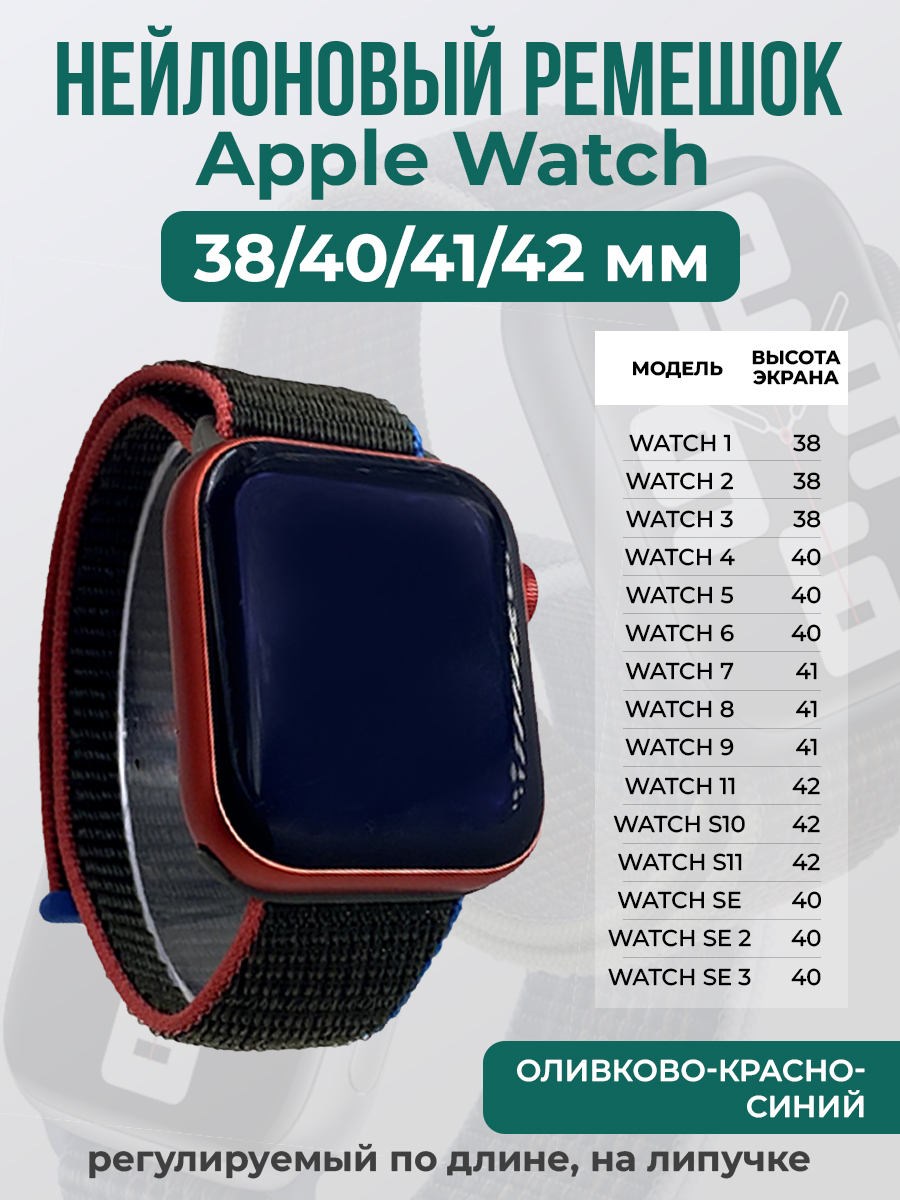 Нейлоновый ремешок на липучке для Apple Watch 1-9 / SE (38/40/41 мм), регулируемый по длине, оливково-красно-синий