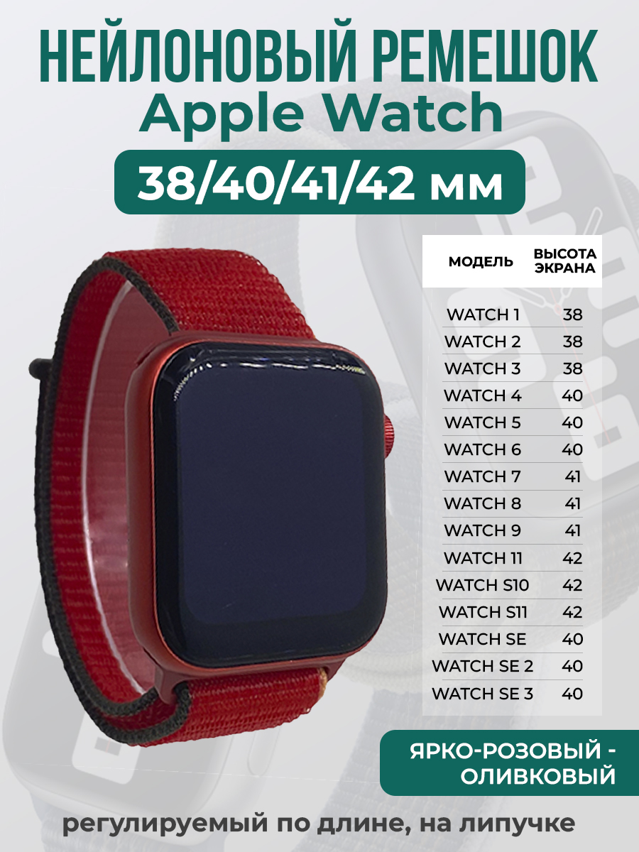 Нейлоновый ремешок на липучке для Apple Watch 1-9 / SE (38/40/41 мм), регулируемый по длине, ярко-розовый - оливковый