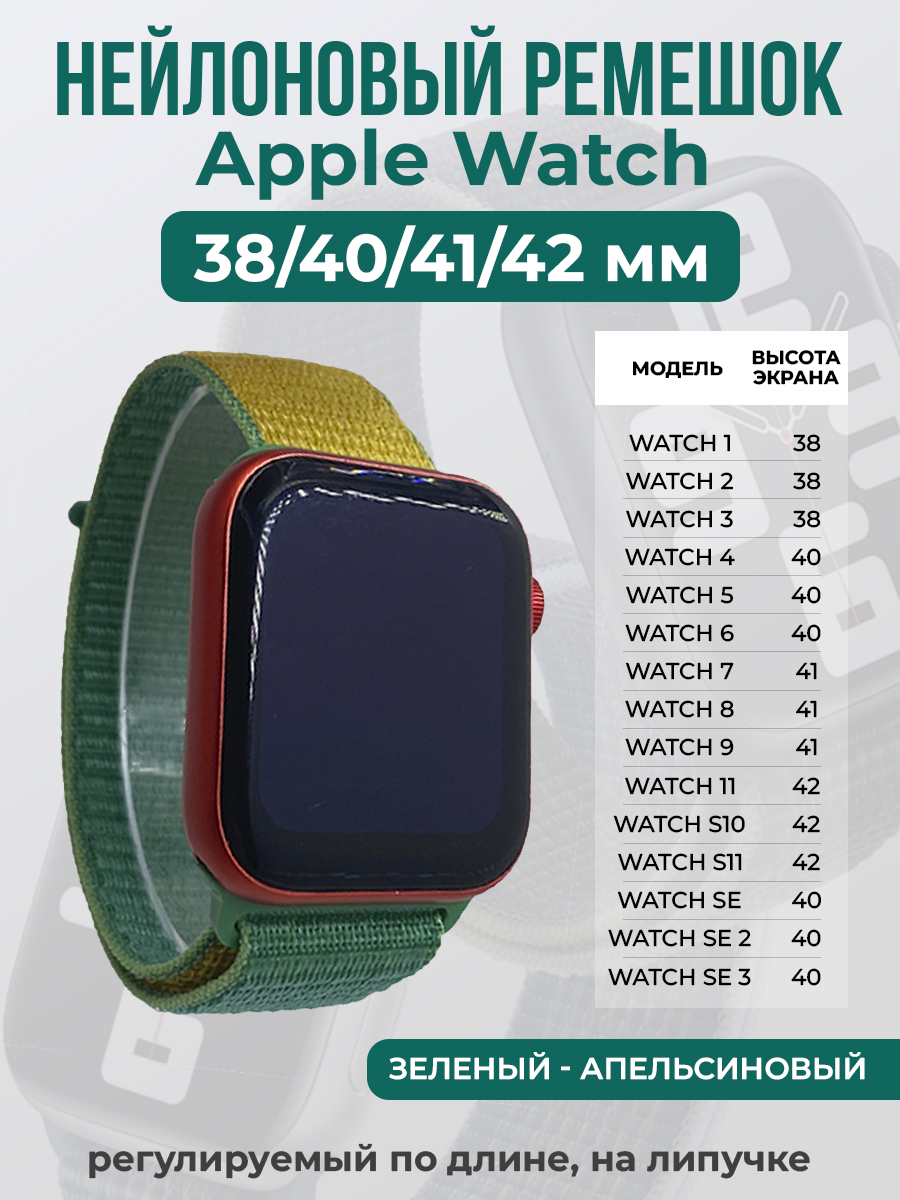 Нейлоновый ремешок на липучке для Apple Watch 1-9 / SE (38/40/41 мм), регулируемый по длине, зеленый - апельсиновый