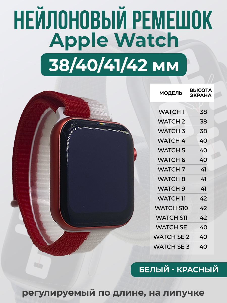 Нейлоновый ремешок на липучке для Apple Watch 1-9 / SE (38/40/41 мм), регулируемый по длине, белый - красный