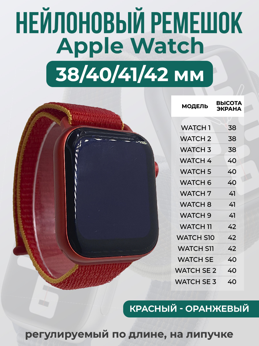 Нейлоновый ремешок на липучке для Apple Watch 1-9 / SE (38/40/41 мм), регулируемый по длине, красный - оранжевый