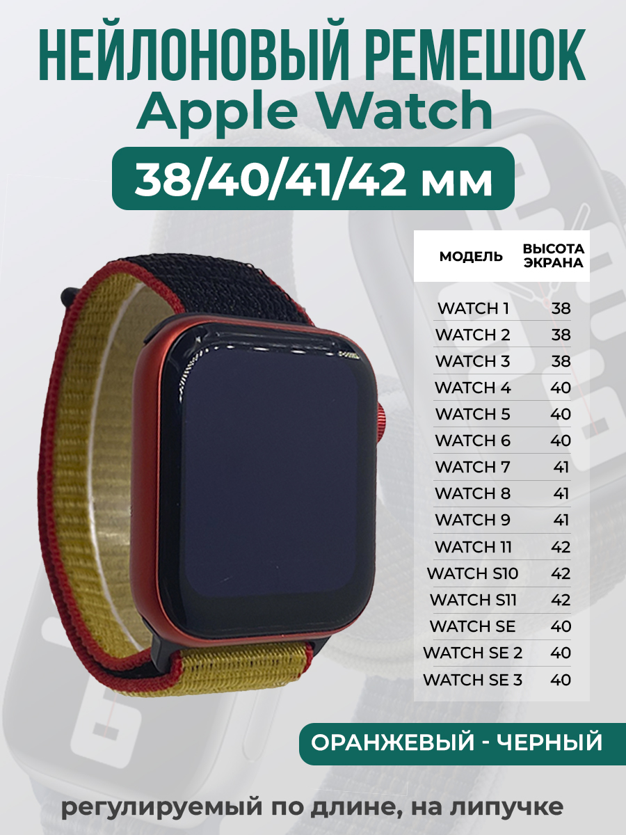 Нейлоновый ремешок на липучке для Apple Watch 1-9 / SE (38/40/41 мм), регулируемый по длине, оранжевый - черный