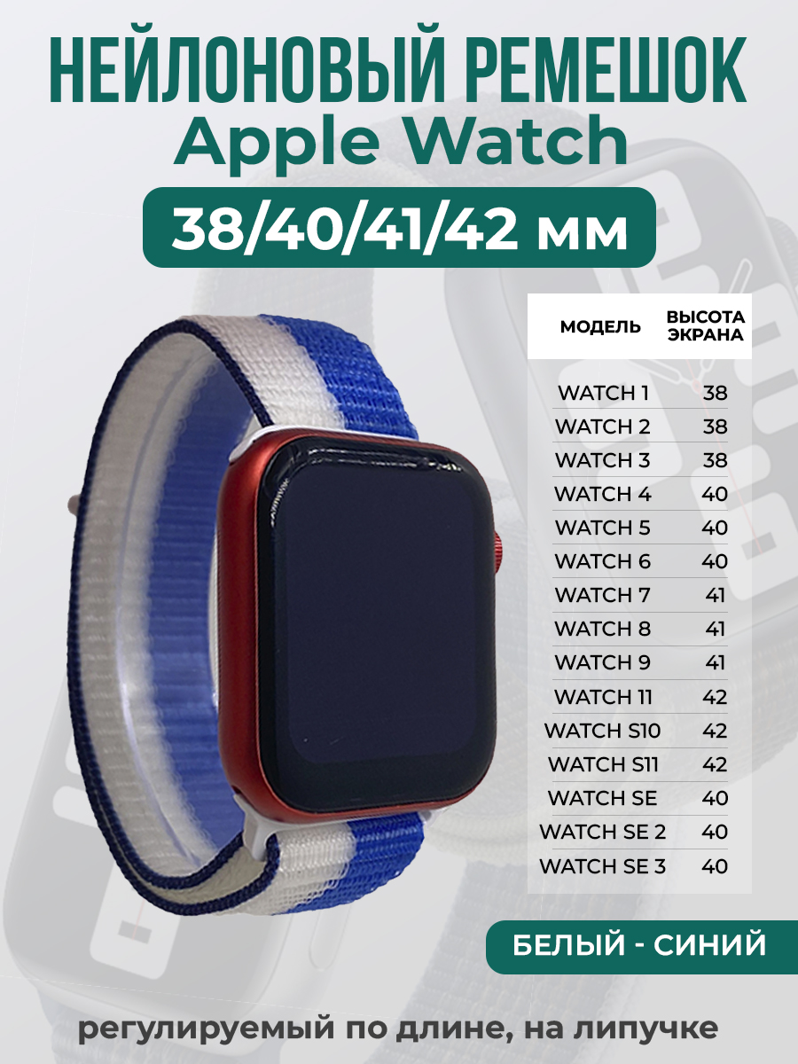 Нейлоновый ремешок на липучке для Apple Watch 1-9 / SE (38/40/41 мм), регулируемый по длине, белый - синий