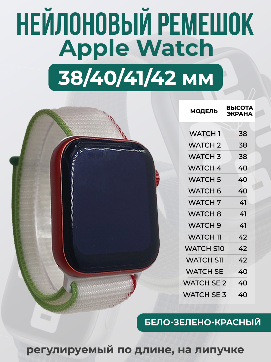 Нейлоновый ремешок на липучке для Apple Watch 1-9 / SE (38/40/41 мм), регулируемый по длине, бело-зелено-красный