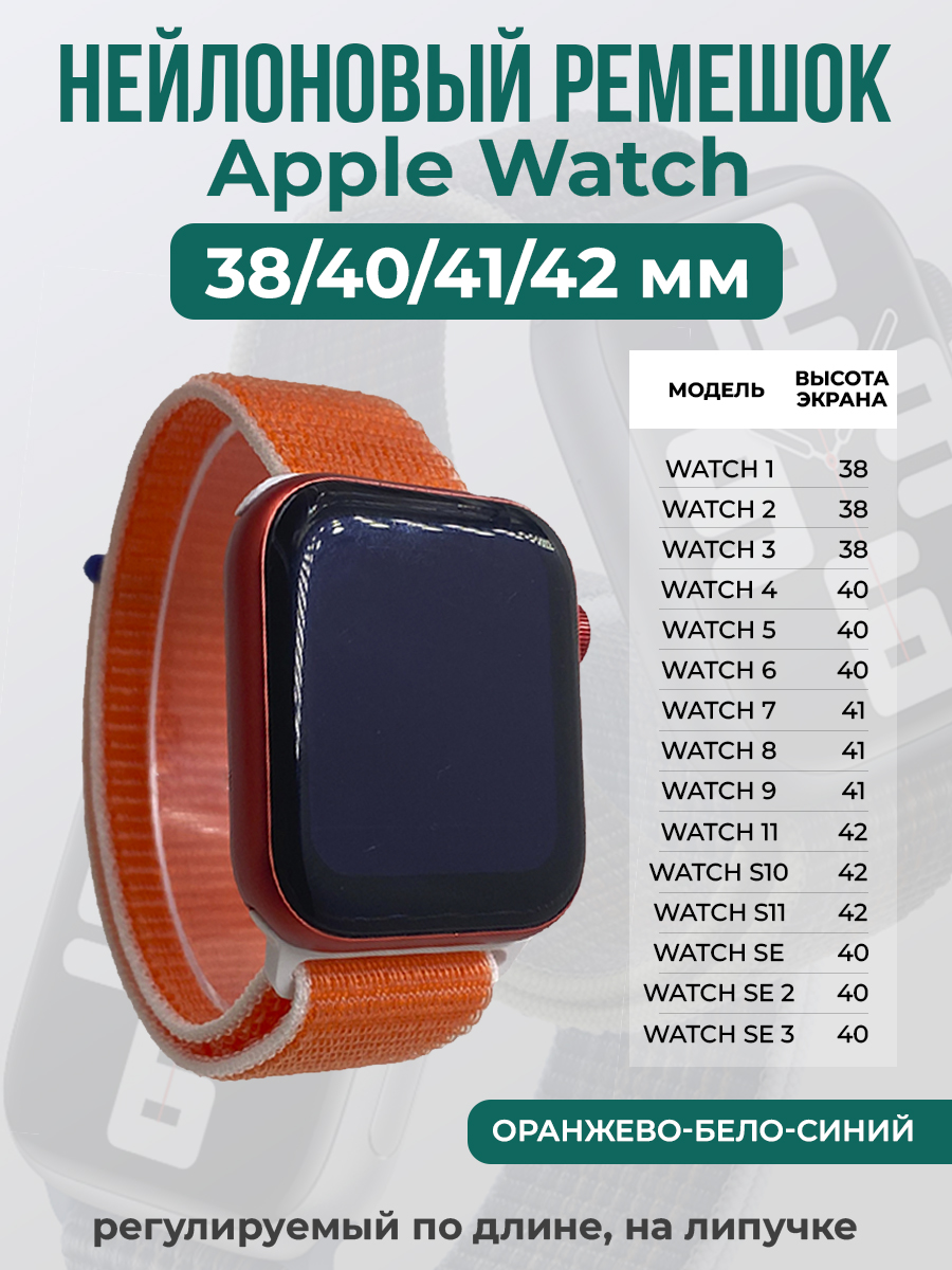 Нейлоновый ремешок на липучке для Apple Watch 1-9 / SE (38/40/41 мм), регулируемый по длине, оранжево-бело-синий