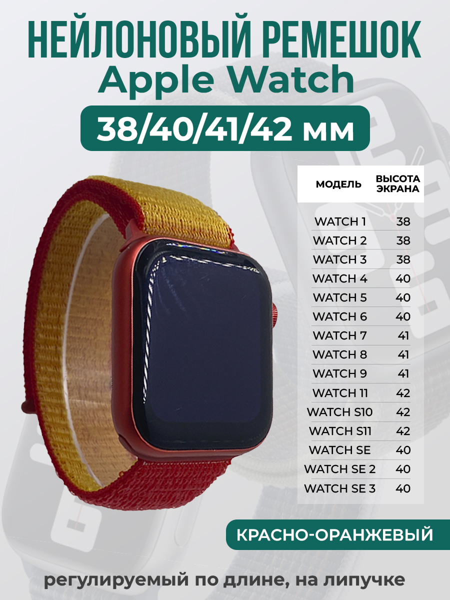 Нейлоновый ремешок на липучке для Apple Watch 1-9 / SE (38/40/41 мм), регулируемый по длине, красно-оранжевый