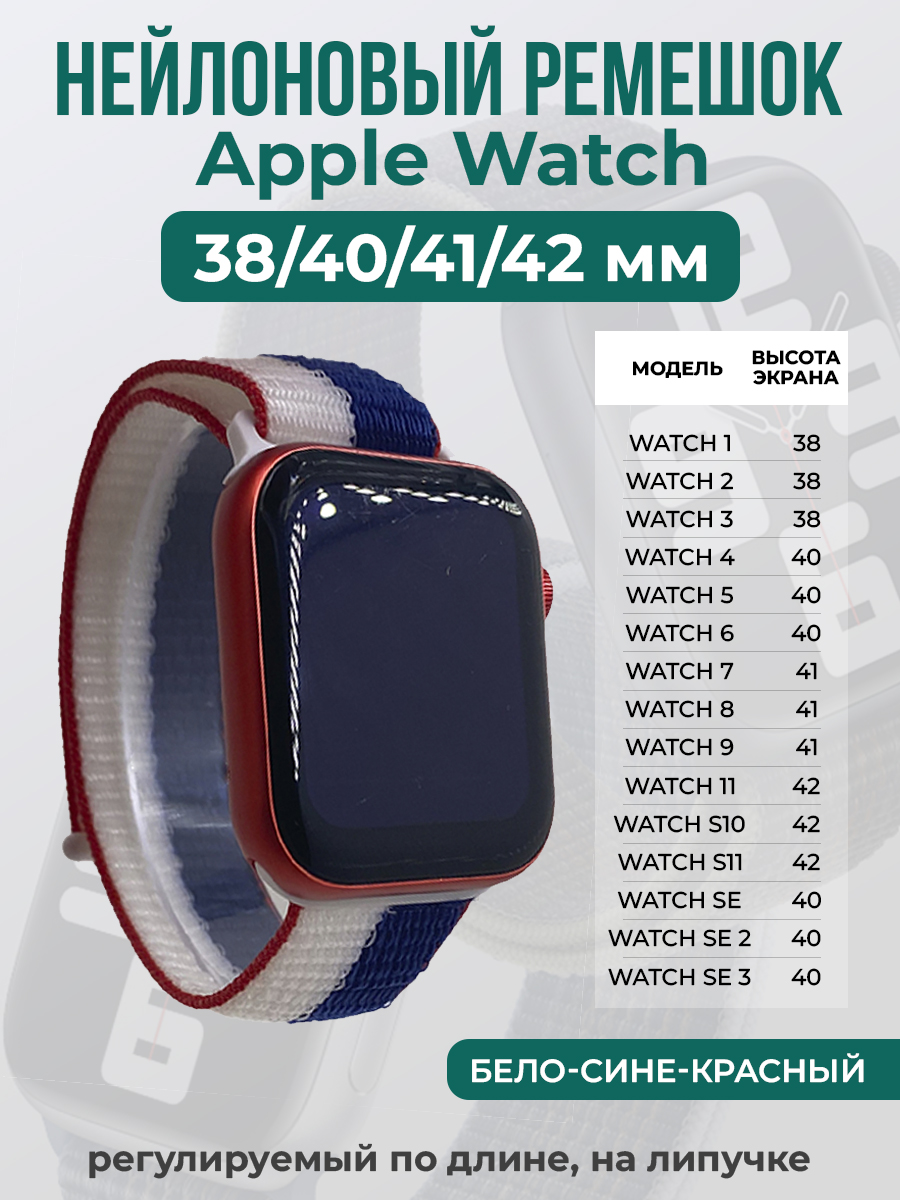 Нейлоновый ремешок на липучке для Apple Watch 1-9 / SE (38/40/41 мм), регулируемый по длине, бело-сине-красный