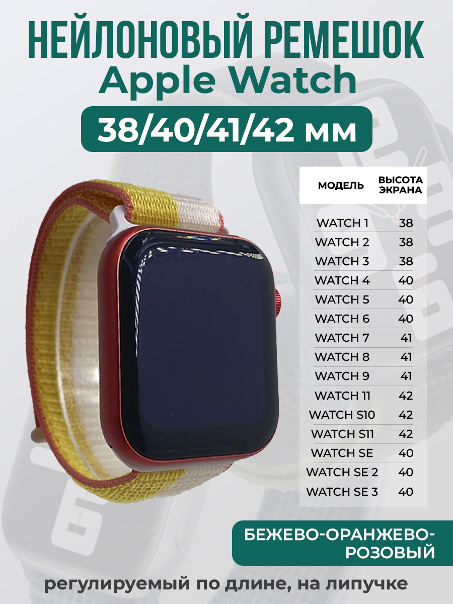 Нейлоновый ремешок на липучке для Apple Watch 1-9 / SE (38/40/41 мм), регулируемый по длине, бежево-оранжево-розовый