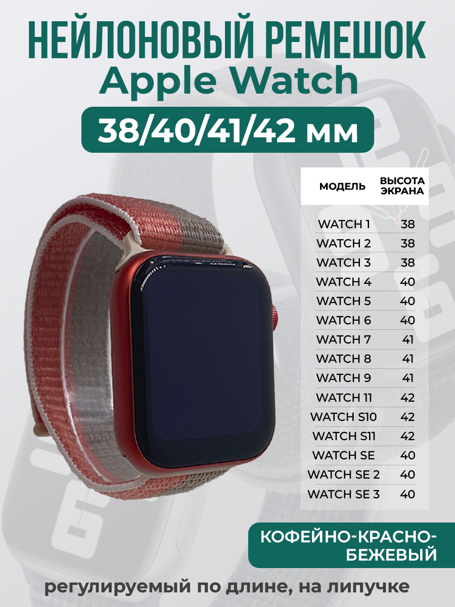 Нейлоновый ремешок на липучке для Apple Watch 1-9 / SE (38/40/41 мм), регулируемый по длине, кофейно-красно-бежевый