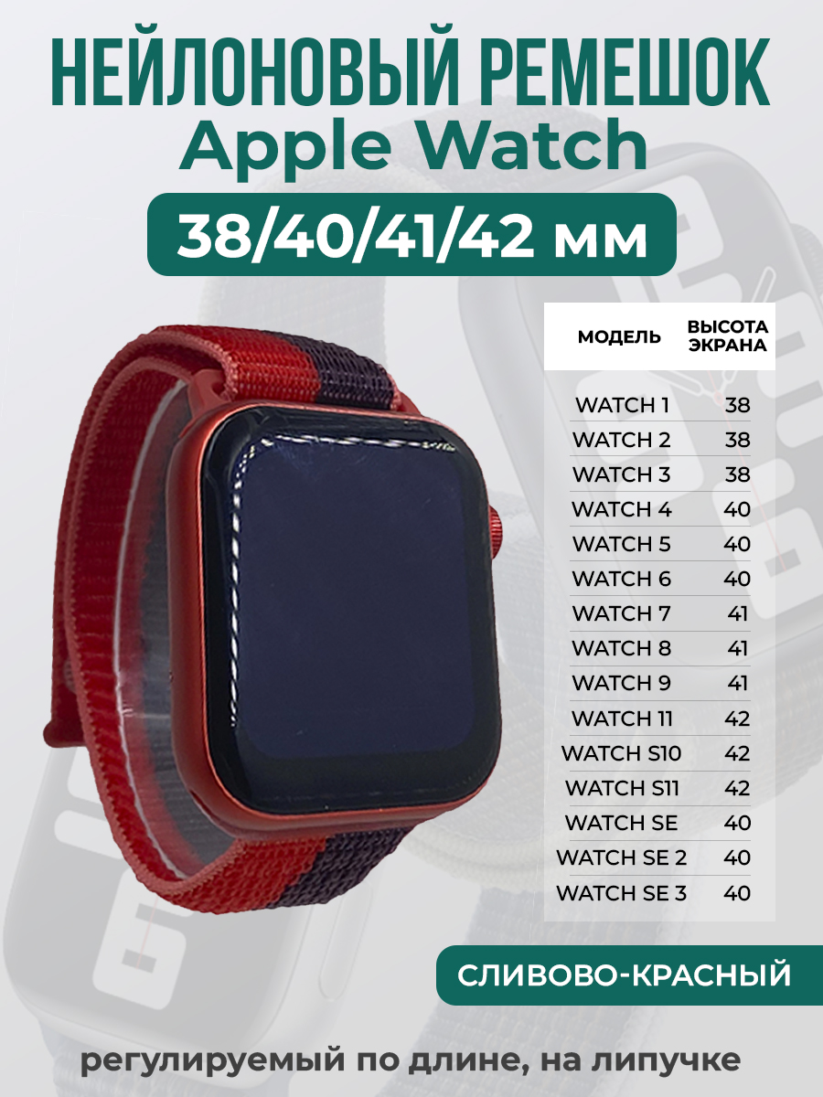 Нейлоновый ремешок на липучке для Apple Watch 1-9 / SE /SE 3 (38/40/41 мм), S10/S11 42 мм, регулируемый по длине, сливово-красный