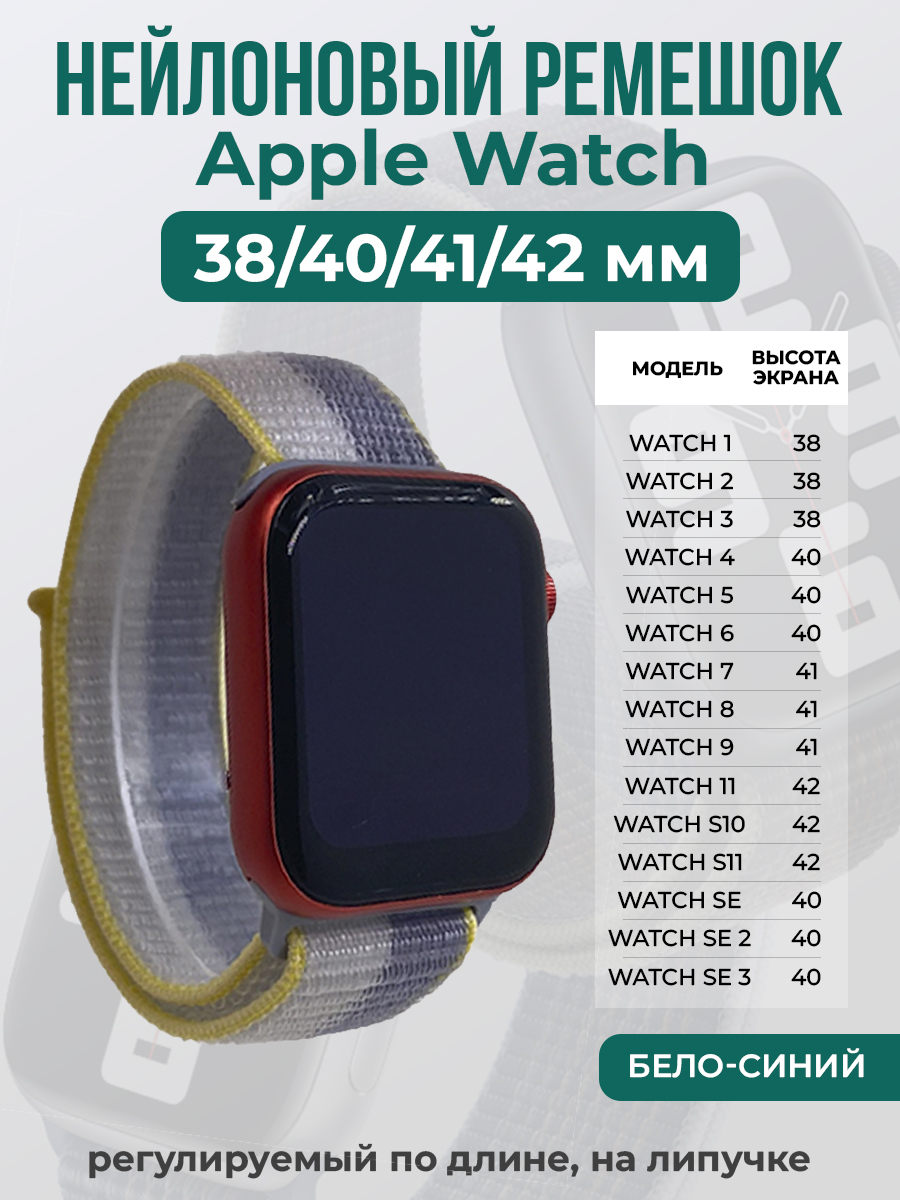 Нейлоновый ремешок на липучке для Apple Watch 1-9 / SE /SE 3 (38/40/41 мм), S10/S11 42 мм, регулируемый по длине, бело-синий