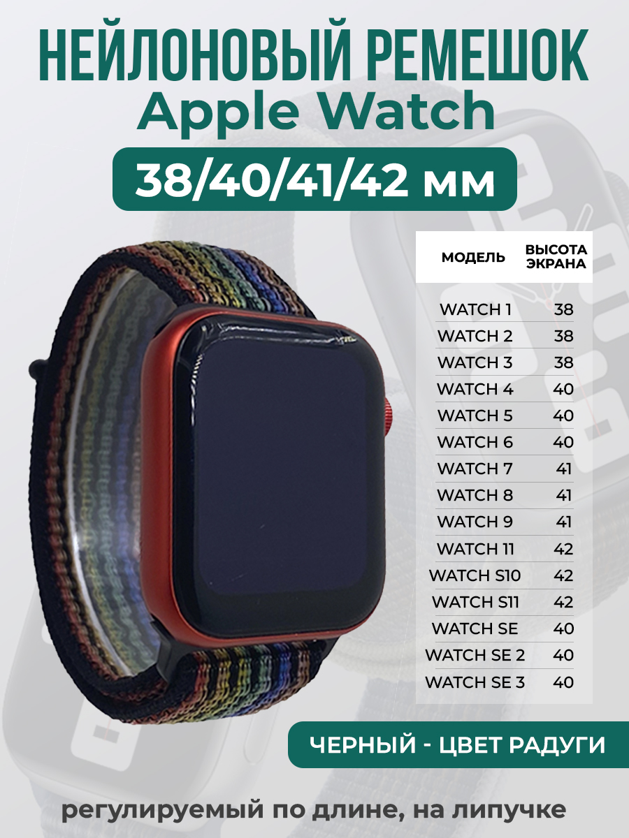 Нейлоновый ремешок на липучке для Apple Watch 1-9 / SE /SE 3 (38/40/41 мм), S10/S11 42 мм, регулируемый по длине, черный - цвет радуги