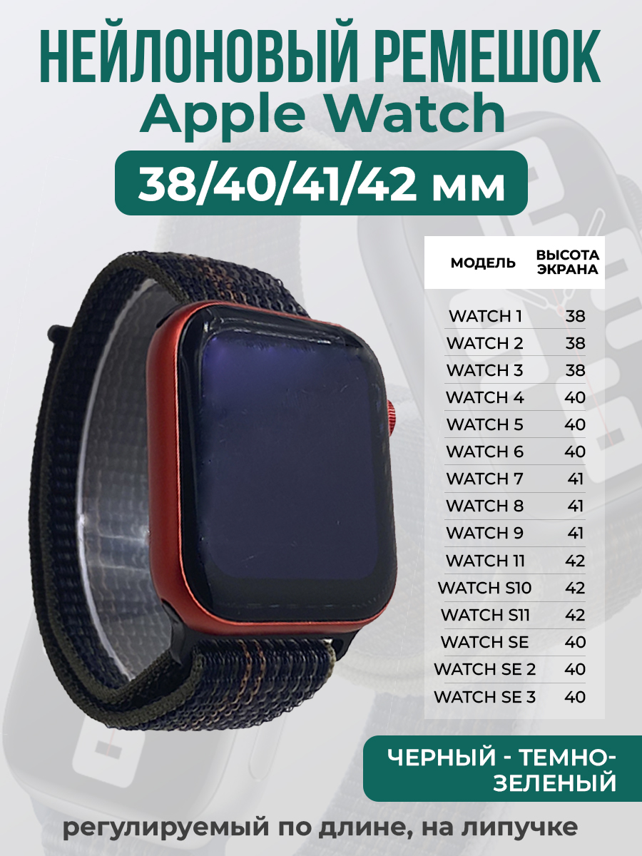 Нейлоновый ремешок на липучке для Apple Watch 1-9 / SE /SE 3 (38/40/41 мм), S10/S11 42 мм, регулируемый по длине, черный - темно-зеленый