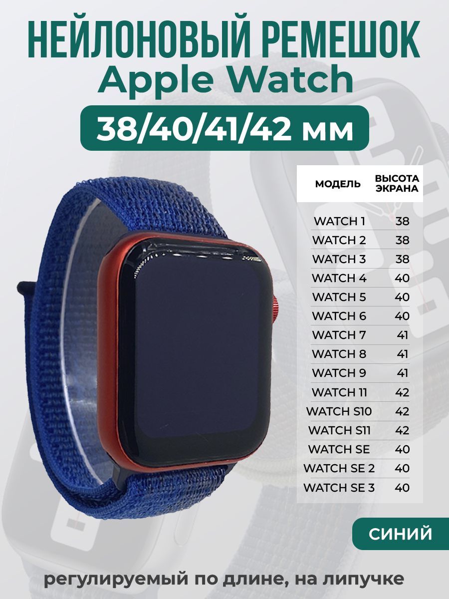 Нейлоновый ремешок на липучке для Apple Watch 1-9 / SE /SE 3 (38/40/41 мм), S10/S11 42 мм, регулируемый по длине, синий