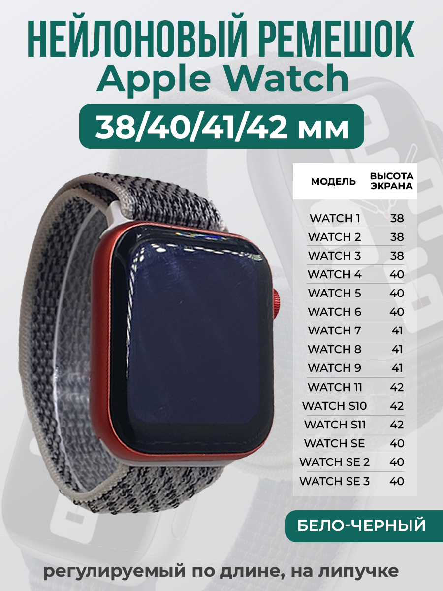 Нейлоновый ремешок на липучке для Apple Watch 1-9 / SE /SE 3 (38/40/41 мм), S10/S11 42 мм, регулируемый по длине подходит для смарт-часов Apple Watch series 1/2/3/4/5/6/7/8/9/SE с размерами циферблата: 38 мм, 40 мм, 41 мм и 42 мм. Ремешок для часов iPhone выполнен из гипоаллергенного нейлона.