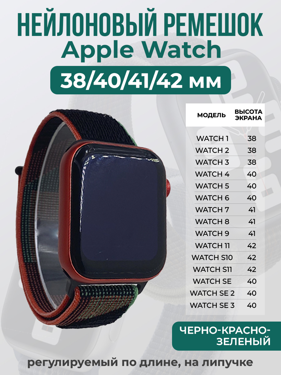 Нейлоновый ремешок на липучке для Apple Watch 1-9 / SE /SE 3 (38/40/41 мм), S10/S11 42 мм, регулируемый по длине, черно-красно-зеленый