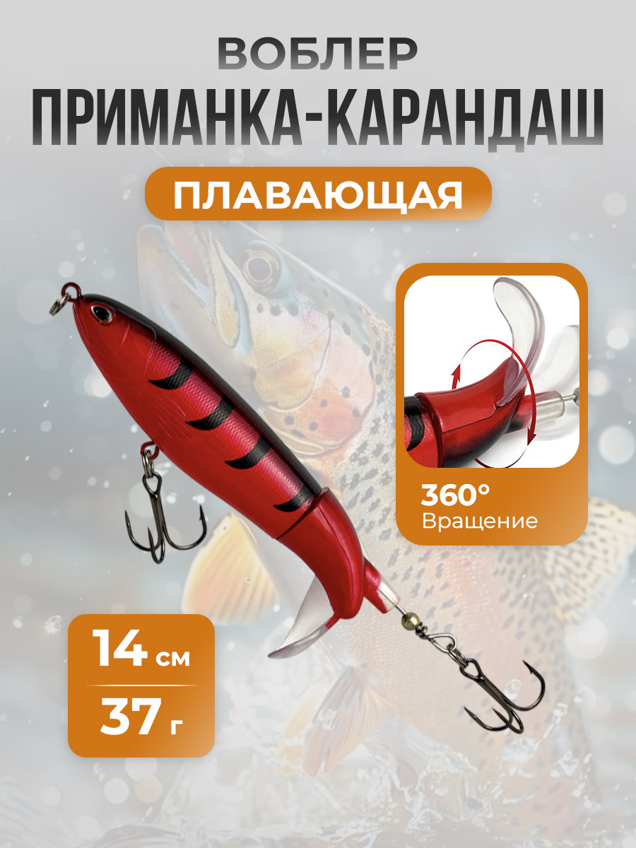 Приманка-карандаш класса "Плавающие (floating) - F", 14 см, 37 г — это современная приманка для рыбалки, разработанная для максимального привлечения хищной рыбы и повышения связности попаданий в условиях как на стоячей воде, так и в быстрой струе. Ее уникальная конструкция в форме цилиндрического карандаша обеспечивает стабильное полетное поведение при забросе и небольшую боковую раскачку на свободном движении, что делает ее заметной и узнаваемой на воде. Основной принцип работы основан на двух ключевых элементах: плавучесть и динамическая вибрация. Тело приманки изготовлено из прочного и легкого по весу материала, что позволяет ей удерживаться на плаву даже при активной проводке. Водонепроницаемая и жесткая конструкция обеспечивает долговечность и устойчивость к износу при частом контакте с донной поверхностью и растительностью.