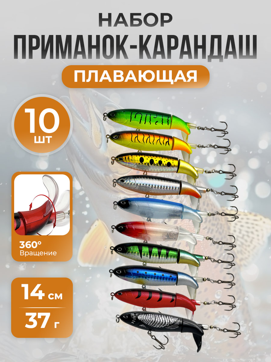 Набор плавающих приманок-карандаш 10 шт, класса "Плавающие (floating) - F", 14 см, 37 г — это современная приманка для рыбалки, разработанная для максимального привлечения хищной рыбы и повышения связности попаданий в условиях как на стоячей воде, так и в быстрой струе. Ее уникальная конструкция в форме цилиндрического карандаша обеспечивает стабильное полетное поведение при забросе и небольшую боковую раскачку на свободном движении, что делает ее заметной и узнаваемой на воде. Основной принцип работы основан на двух ключевых элементах: плавучесть и динамическая вибрация. Тело приманки изготовлено из прочного и легкого по весу материала, что позволяет ей удерживаться на плаву даже при активной проводке. Водонепроницаемая и жесткая конструкция обеспечивает долговечность и устойчивость к износу при частом контакте с донной поверхностью и растительностью.