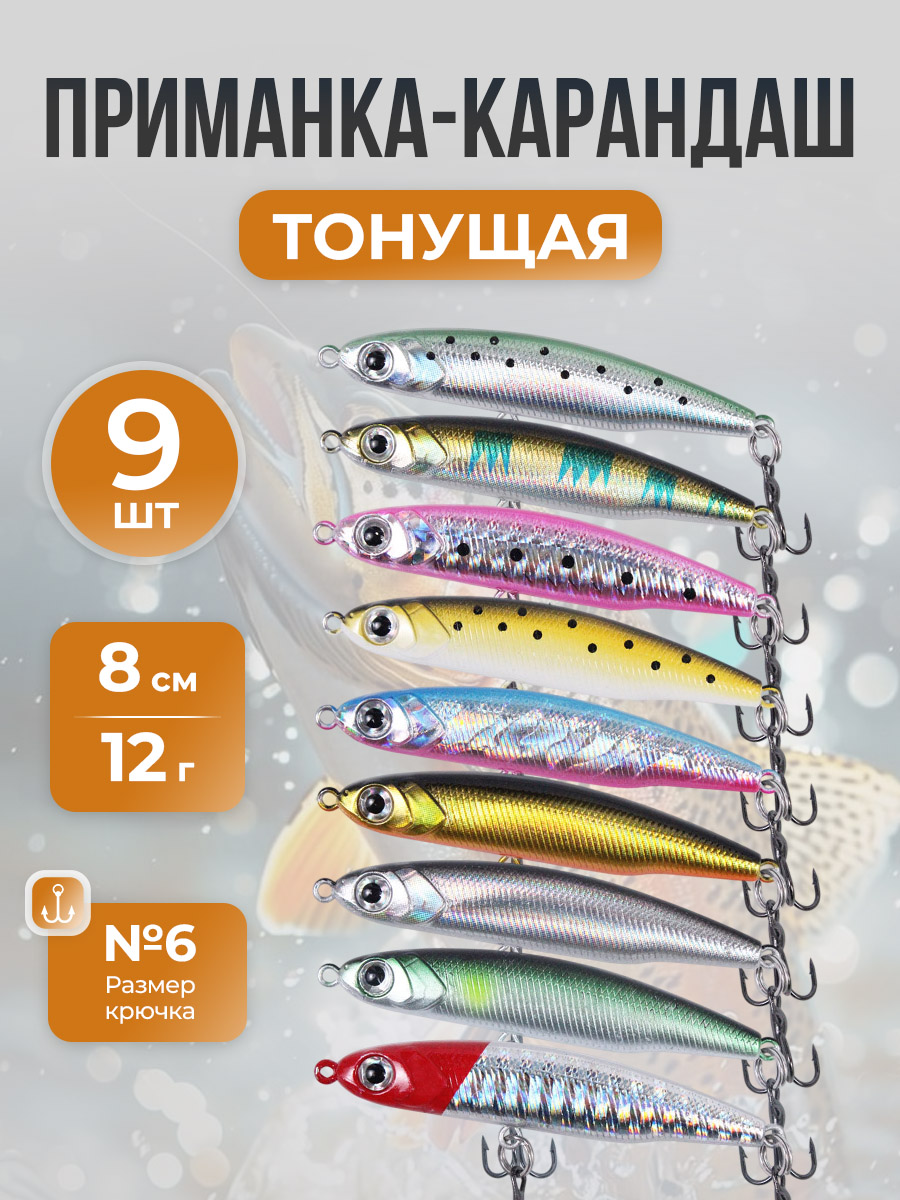 Набор воблеров приманок-карандаш, тонущие 8 см/12 г, 9 шт, разноцветные