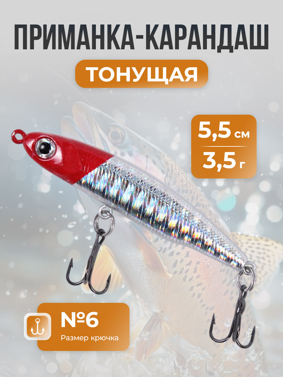 Воблер приманка-карандаш, тонущая 5,5 см/3,5 г, серебристо-красная