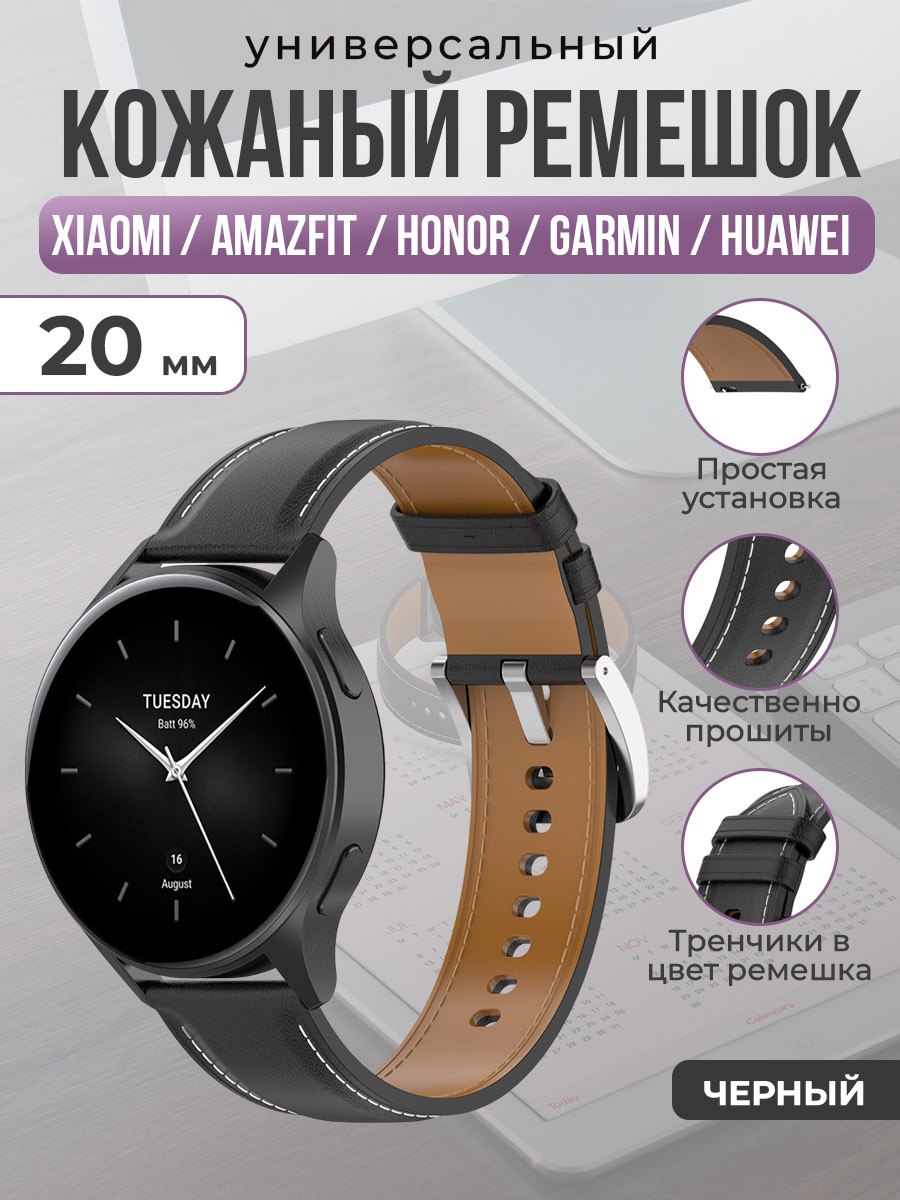 Универсальный кожаный ремешок для Xiaomi, Amazfit, Honor, Garmin, Huawei, 20 мм, черный