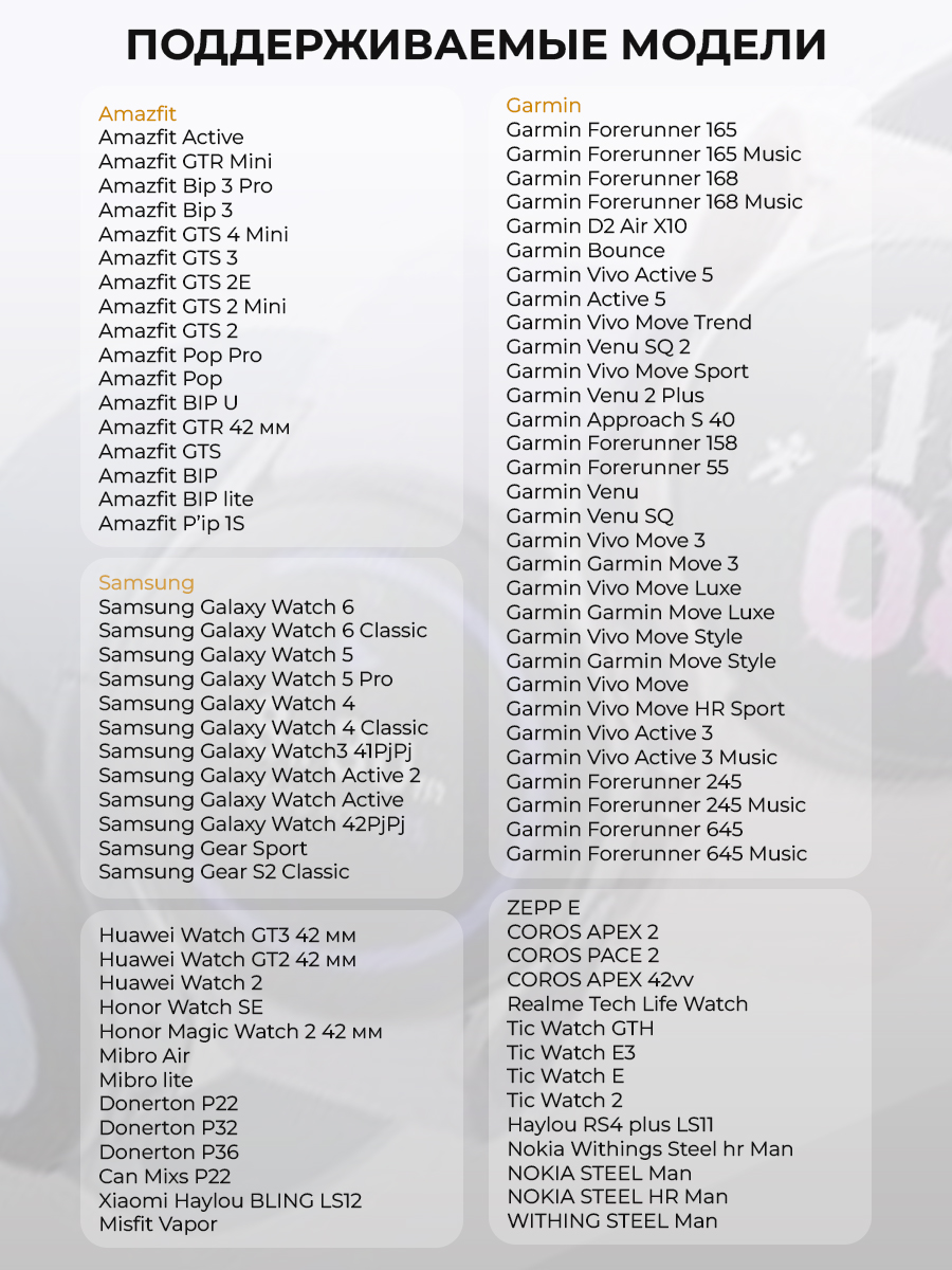 Разноцветный ремешок для часов универсальный 20 мм был разработан с учетом потребностей потребителей, что делает его подходящим для множества популярных брендов, таких как Amazfit GTR,BIP (Амазфит жтр, бип), Garmin Forerunner/Venu/Vivo (Форераннер, Вену, Виво); Samsung Galaxy Watch (Самсунг Гелакси Вотч) Huawei Watch (Хуавей Вотч) Honor Watch (Хонор Вотч) Realme (Риалми) Haylou (Хайлоу) Xiaomi (Сиаоми/Сяоми/Ксиоми/Ксиаоми), Mibro (Мибро), Fossil Gen (Фоссил Джен), TicWatch Pro (ТикВотч Про). Подробный перечень совместимых моделей умных часов можно посмотреть в галерее изображений.