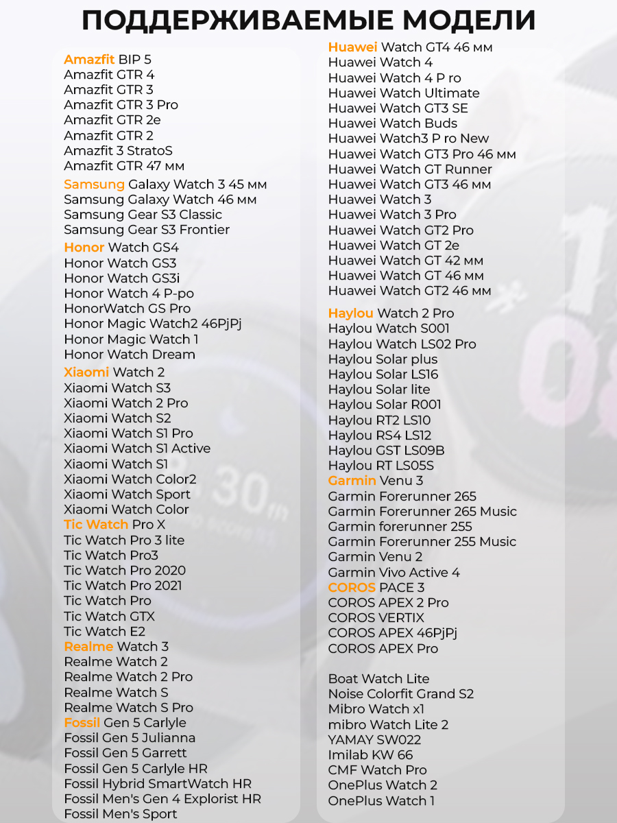 Разноцветный ремешок для часов универсальный 22 мм был разработан с учетом потребностей потребителей, что делает его подходящим для множества популярных брендов, таких как Amazfit GTR,BIP (Амазфит жтр, бип), Garmin Forerunner/Venu/Vivo (Форераннер, Вену, Виво); Samsung Galaxy Watch (Самсунг Гелакси Вотч) Huawei Watch (Хуавей Вотч) Honor Watch (Хонор Вотч) Realme (Риалми) Haylou (Хайлоу) Xiaomi (Сиаоми/Сяоми/Ксиоми/Ксиаоми), Mibro (Мибро), Fossil Gen (Фоссил Джен), TicWatch Pro (ТикВотч Про). Подробный перечень совместимых моделей умных часов можно посмотреть в галерее изображений.