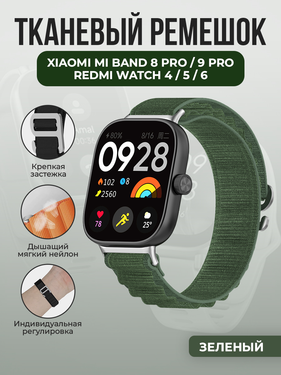 Тканевый ремешок для Xiaomi Mi Band 8 Pro/9 Pro и Redmi Watch 4/5/6, зеленый