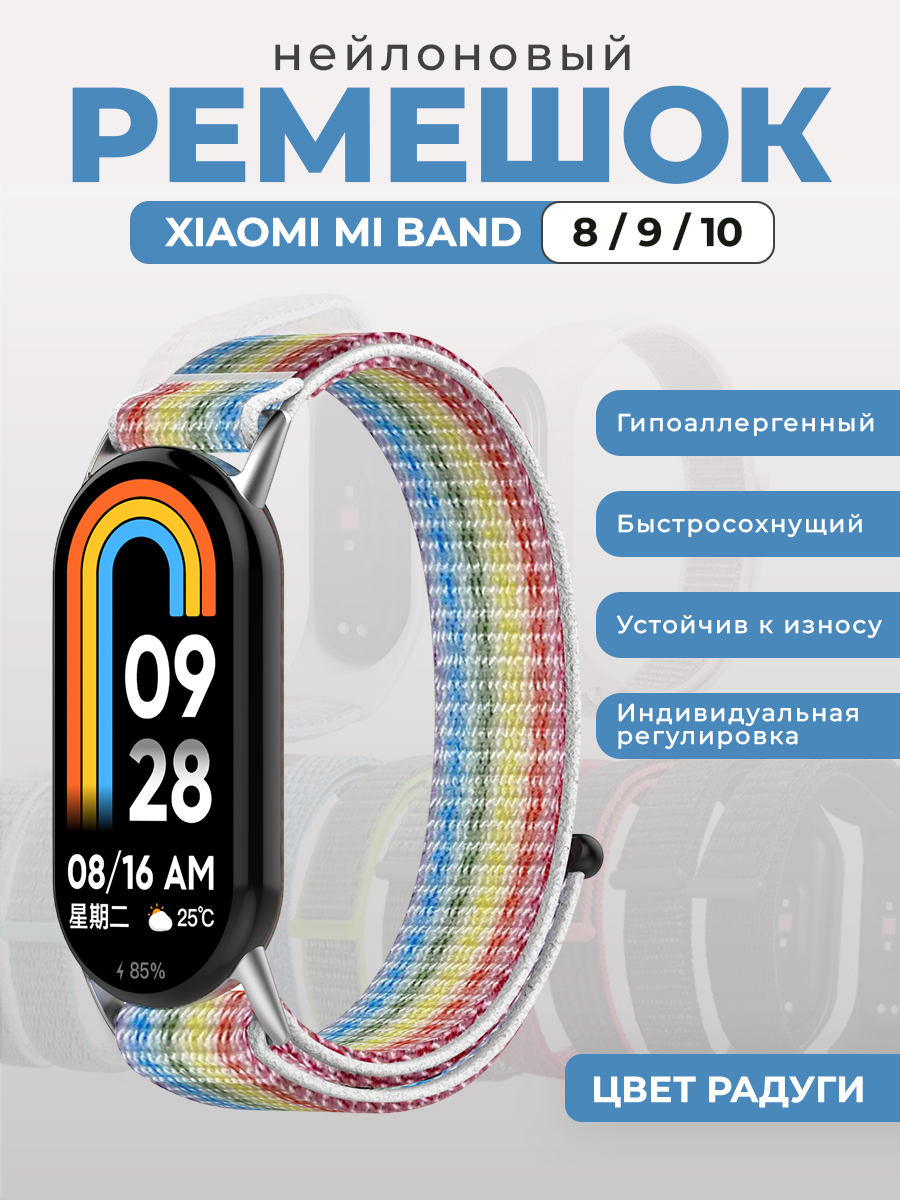 Нейлоновый ремешок для Xiaomi Mi Band 8/9/10, на липучке, цвет радуги