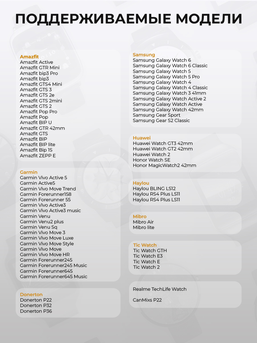 Ремешок для часов универсальный 20 мм был разработан с учетом потребностей потребителей, что делает его подходящим для множества популярных брендов, таких как Amazfit GTR,BIP (Амазфит жтр, бип), Garmin Forerunner/Venu/Vivo (Форераннер, Вену, Виво); Samsung Galaxy Watch (Самсунг Гелакси Вотч), Huawei Watch (Хуавей Вотч) Honor Watch (Хонор Вотч) Realme (Риалми) Haylou (Хайлоу) Xiaomi (Сиаоми/Сяоми/Ксиоми/Ксиаоми), Mibro (Мибро), COROS (Корос), TicWatch Pro (ТикВотч Про). Подробный перечень совместимых моделей можно посмотреть в галерее изображений.